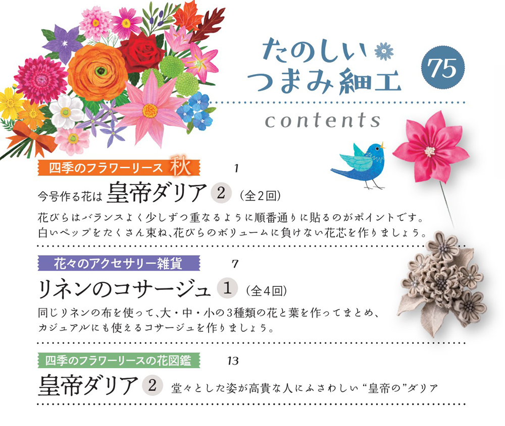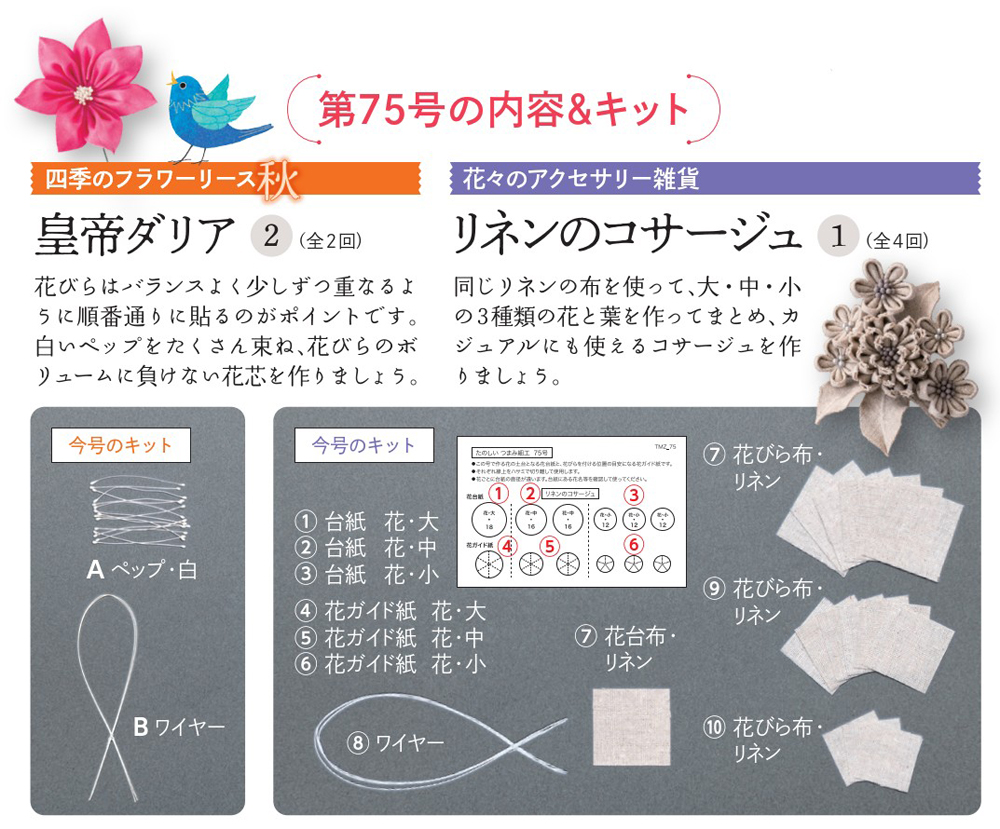 その他の号はこちら たのしい つまみ細工 第75号 商品番号1009050075000000 1,499円 数量 1 2 3 4 5 6 7 8 9 10 カートに入れる 商品概要 発売日:2025年08月05日皇帝ダリア② 他 定期購読する 商品詳細はこちら その他の号はこちら バックナンバー一覧はこちら バインダー・ケースを購入する グッズ・別売りパーツを購入する よくある質問