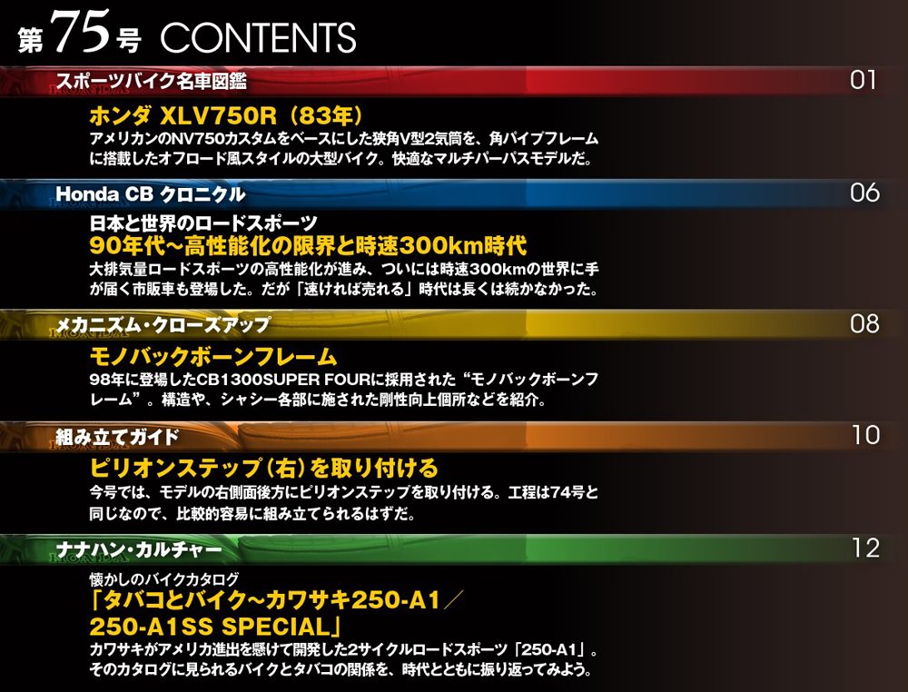 その他の号はこちら ホンダ CB750FOUR 再刊行版 第75号 商品番号1009540075000000 1,999円 数量 1 2 3 4 5 6 7 8 9 10 カートに入れる 商品概要 発売日:2025年07月08日ピリオンステップ(右)を取り付ける その他の号はこちら バックナンバー一覧はこちら バインダー・ケースを購入する グッズ・別売りパーツを購入する コミュニティ よくある質問
