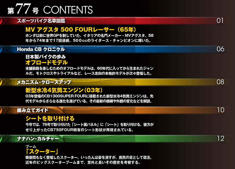 その他の号はこちら ホンダ CB750FOUR 再刊行版 第77号 商品番号1009540077000000 1,999円 数量 1 2 3 4 5 6 7 8 9 10 カートに入れる 商品概要 発売日:2025年07月22日シートを取り付ける その他の号はこちら バックナンバー一覧はこちら バインダー・ケースを購入する グッズ・別売りパーツを購入する コミュニティ よくある質問