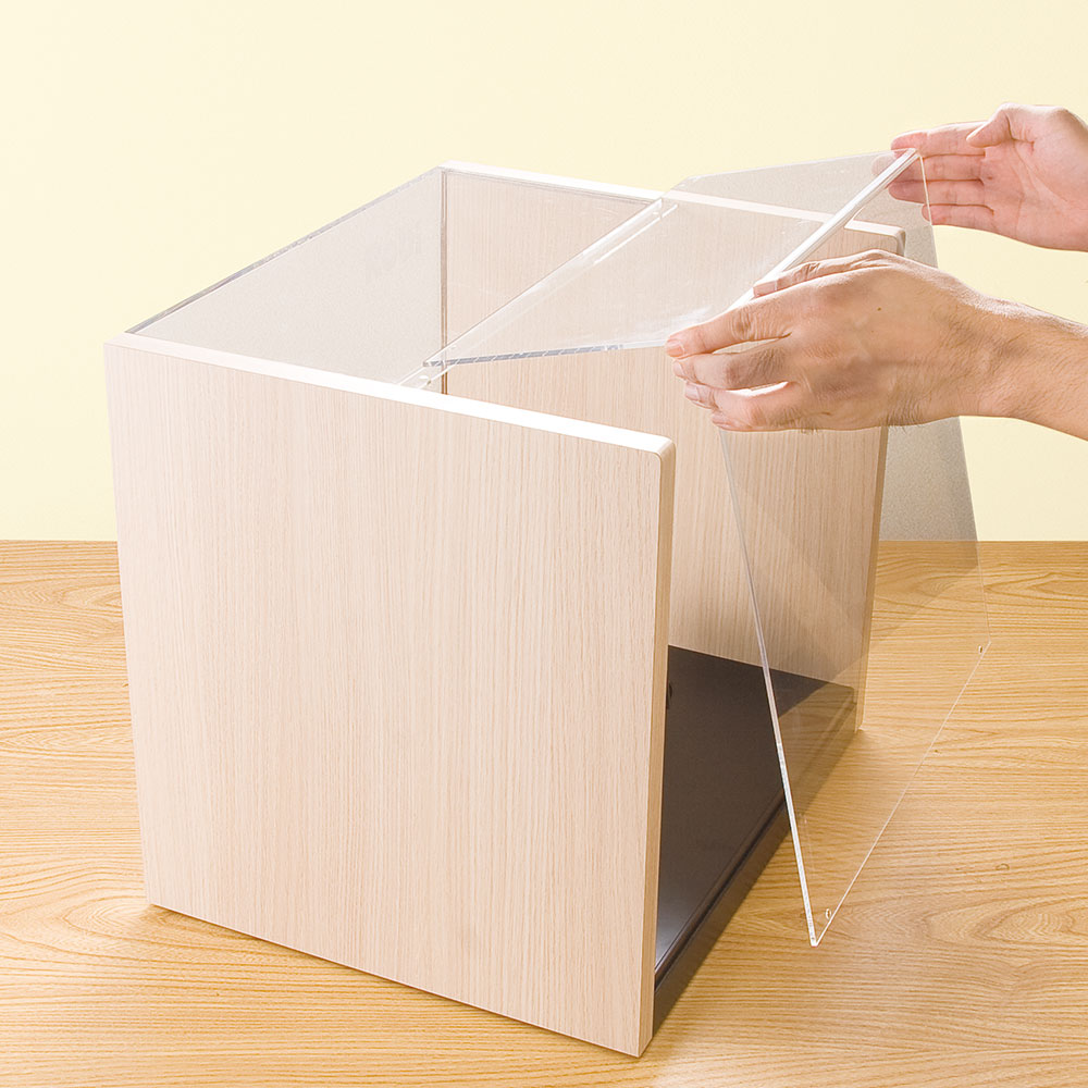 ●簡易組立式:●サイズ:約 横430×高さ397×奥行350mm ●重量:約5.8Kg ●材質: アクリル樹脂、木材(合板) ●絵本:ロビのおるすばん(上下巻)付 ●使用工具: プラスドライバー(#2または#3) ●日本製