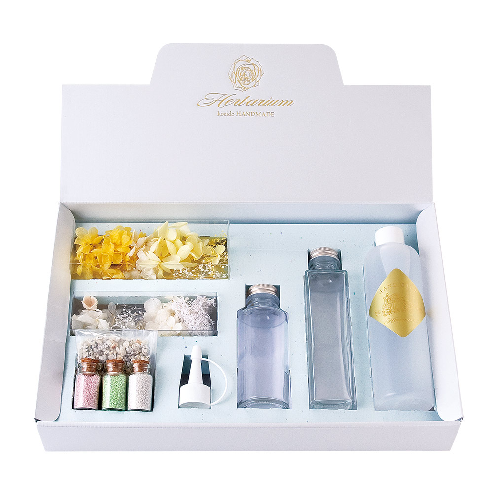 ●箱サイズ:約 幅355×奥行235×高さ60mm ●セット内容:プリザーブドフラワー約6.5g、カラーサンドボトル各約10gx3色、ハーバリウムストーン約30g、ハーバリウムボトル①(40mm×40mm×170mm、約164ml)、ハーバリウムボトル②(φ45mm×125mm、約114ml)、ハーバリウムオイル:約300ml ●日本製