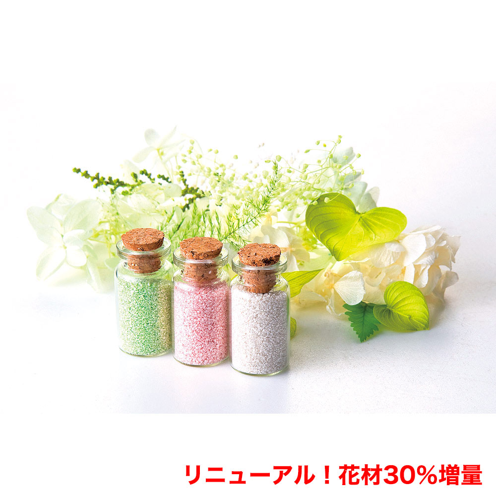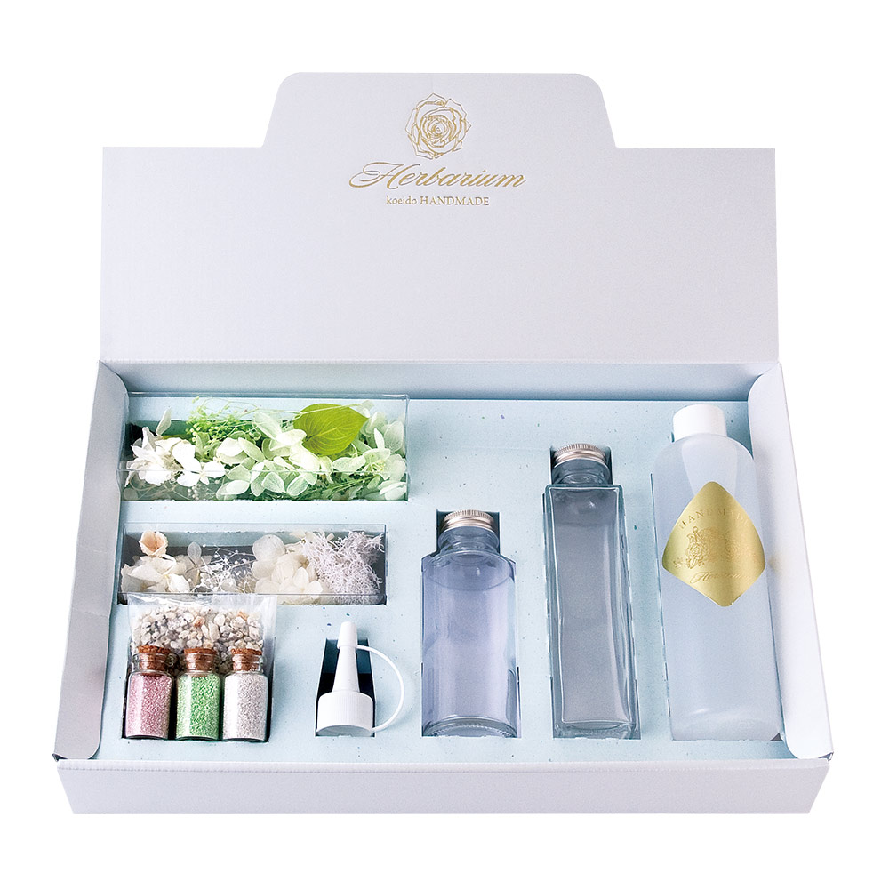 ●箱サイズ:約 幅355×奥行235×高さ60mm ●セット内容:プリザーブドフラワー約6.5g、カラーサンドボトル各約10gx3色、ハーバリウムストーン約30g、ハーバリウムボトル①(40mm×40mm×170mm、約164ml)、ハーバリウムボトル②(φ45mm×125mm、約114ml)、ハーバリウムオイル:約300ml ●日本製