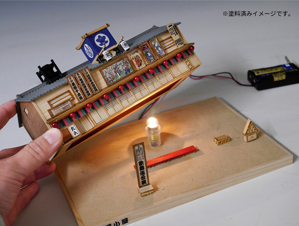 江戸の華やかな賑わいを手のひらサイズで再現しました。外壁は主にヒノキ材を使用、看板は木の質感を活かす透明シールや和紙、カラー印刷を使用し、細部まで忠実に再現。提灯部分には赤いパールビーズを使用し、立体的で華やかな仕上がり。本体内部にライトを内蔵する電球付き。