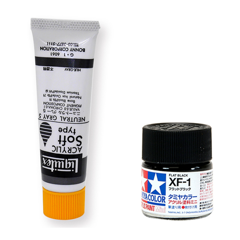 ●塗料セット:リキテックス:水性アクリル絵具(ニュートラルグレー5:2本)、タミヤ アクリル塗料(フラットブラック(XF-1)10cc:1瓶)