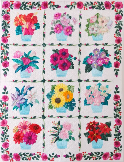 キルトが初めての方でも、簡単できれいに作れる工夫が満載!オリジナルのむら染めプリントで表現した、花の美しさをお楽しみください。