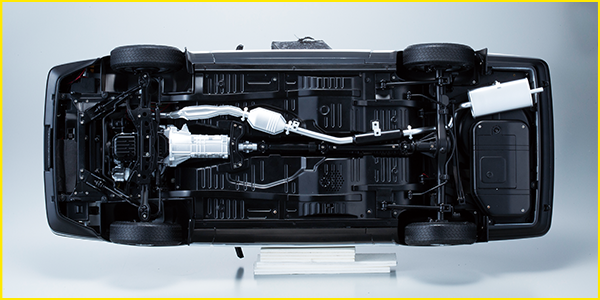 シャシーや前後の車軸も実車と同じ設計。完成模型はサスペンションも表現できる。