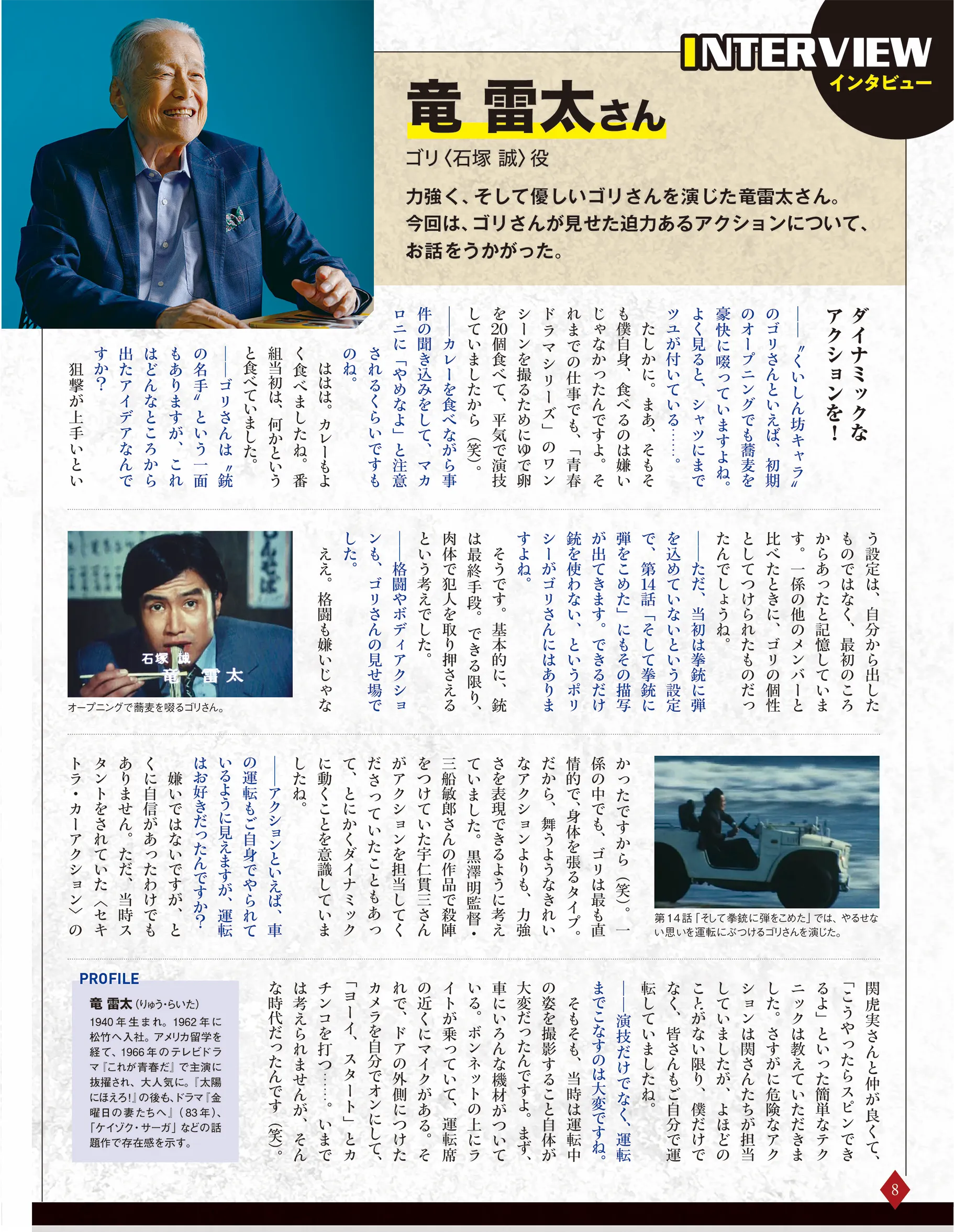 竜雷太&小野寺昭&岡田晋吉が語る舞台裏『太陽にほえろ!』の誕生秘話や名場面の裏側、キャストへの思いについて、竜雷太・小野寺昭・岡田晋吉プロデューサーが語る貴重なインタビューを掲載。