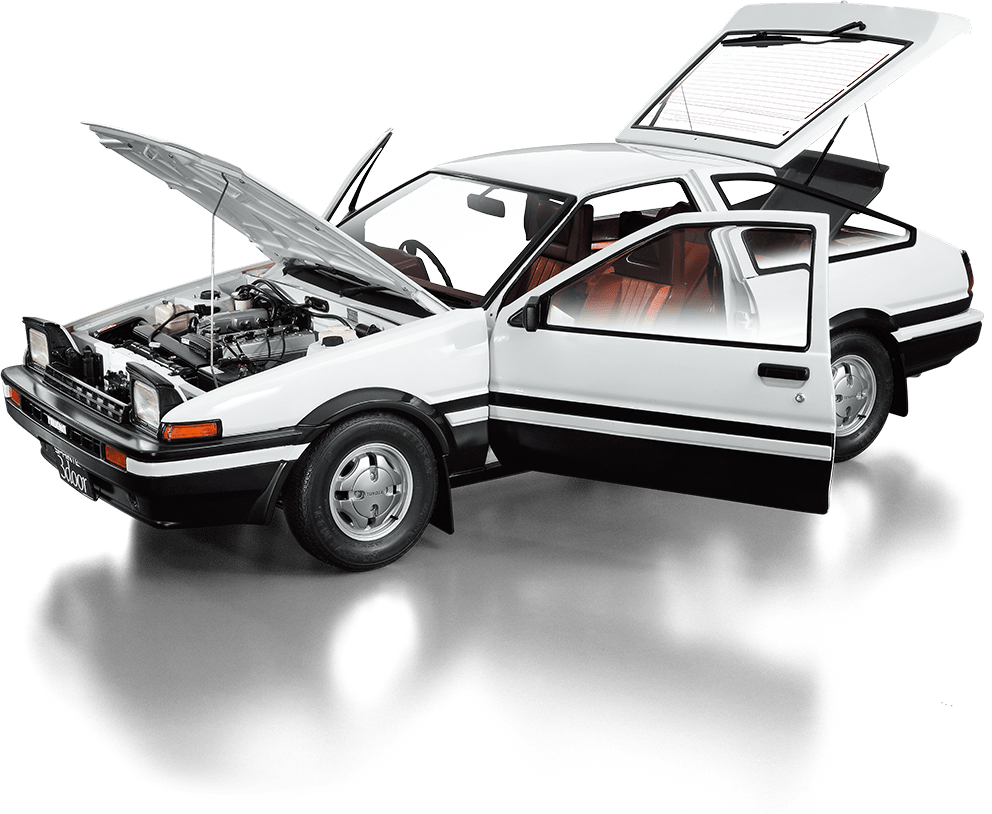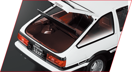 - 中古車市場で高値で取引されるスプリンタートレノの前期型GTアペックスを再現。ノーマル仕様にこだわったファン待望の保存版モデルとなっている。AE86の心臓、4A-GEU型エンジンもパーツから組み上げていく。